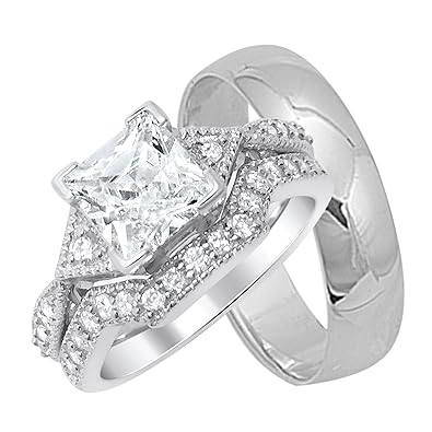 His And Her Princess Cut Trio Wedding Rings Set Sterling Silver