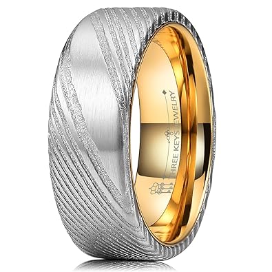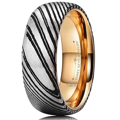 Three Keys Jewelry 8mm Damascus Steel Mens Wedding Ring Domed Wood